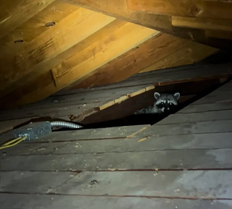 Homeowners with a raccoon family in the attic are frequently tipped off to their presence by the young crying/whining. Other homeowners see missing shingles or pieces of their homes exterior laying on the ground. If a raccoon family is in the attic it will consist of the sow and her kit, no male/boar. The sow will be with the offspring for up to a year spending most of her time the first few months nursing, foraging and attempting to rest. Like most mammals the young depend on their mother for their survival. For this reason it’s important to keep the family together and evict as a group. If you believe you have a raccoon living in your attic contact the wildlife professionals at Critter Evictors for more information!